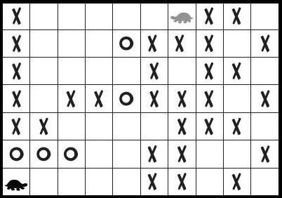 Soru-1: Verilen resme göre piyonumuzun köşeden başladığını düşünürsek silik olarak gösterilmiş varış noktasına gitmesi için gerekli olan akış şeması adımları nasıl olmalıdır? (X sembollerinden geçemez, O sembollerin üzerinden zıplamalıdır.)
