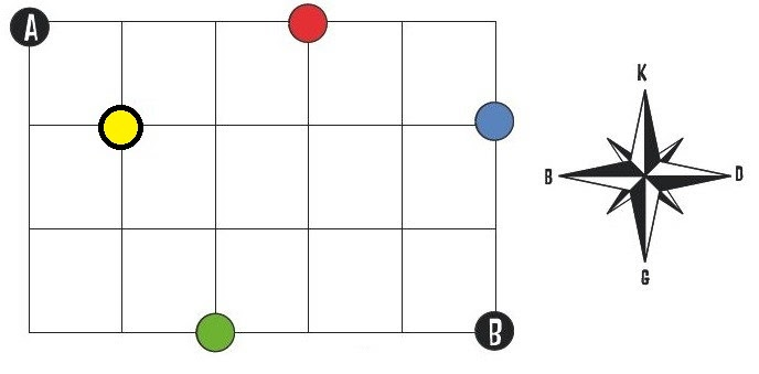 Soru-1: Yukarıdaki resimde A noktasından başlayan bir kişi en az 3 noktaya değerek B noktasına ulaşmak istemektedir. Bunun için en kısa yolu bulunuz.