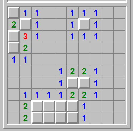 Soru-1: Yukarıda mayın tarlası oyunundan bir sahne gösterilmiştir. Oyunda verilen sayılar o hücrenin kaç komşusunda mayın olduğunu belirtmektedir. Örneğin bir hücrede 3 yazıyorsa tam 3 komşusunda mayın bulunmaktadır.