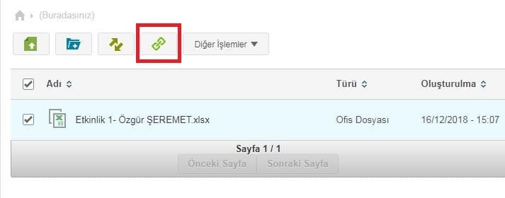 Yukarıda gördüğünüz gibi etkinliğimiz artık bulut alanımız içerisinde sıra geldi bu dosyayı öğretmenimize göndermeye. Bunun için resimde gördüğünüz gibi etkinliği seçin ve kırmızı kutucuk ile işaretlediğimiz butona basınız.