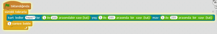 Burada farklı olarak işlemler menüsü içerisinde bulunan … ile … arasında bir sayı tut kodunu kullanıyoruz. kırmızı, yeşil ve mavi seçeneklerine bu kodları atarak değerlerini 1 ile 255 arasında belirliyoruz. Rastgele belirlenecek bu değerler ile bir renk ortaya çıkıyor ve ledlerimiz bu rengi bize gösteriyor. Sizde uygulamak için aşağıdaki kod bloklarını kullanabilirsiniz.