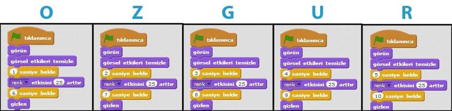 Bunun için “O” Harfine tıklıyorum ve onu seçili hale getiriyorum. Sahnenin sağ tarafında bulunan seçeneklerden DİZİLER menüsü altında bulunan kodları kullanarak sırasıyla tüm harfler için aşağıdaki kodları ekliyorum.